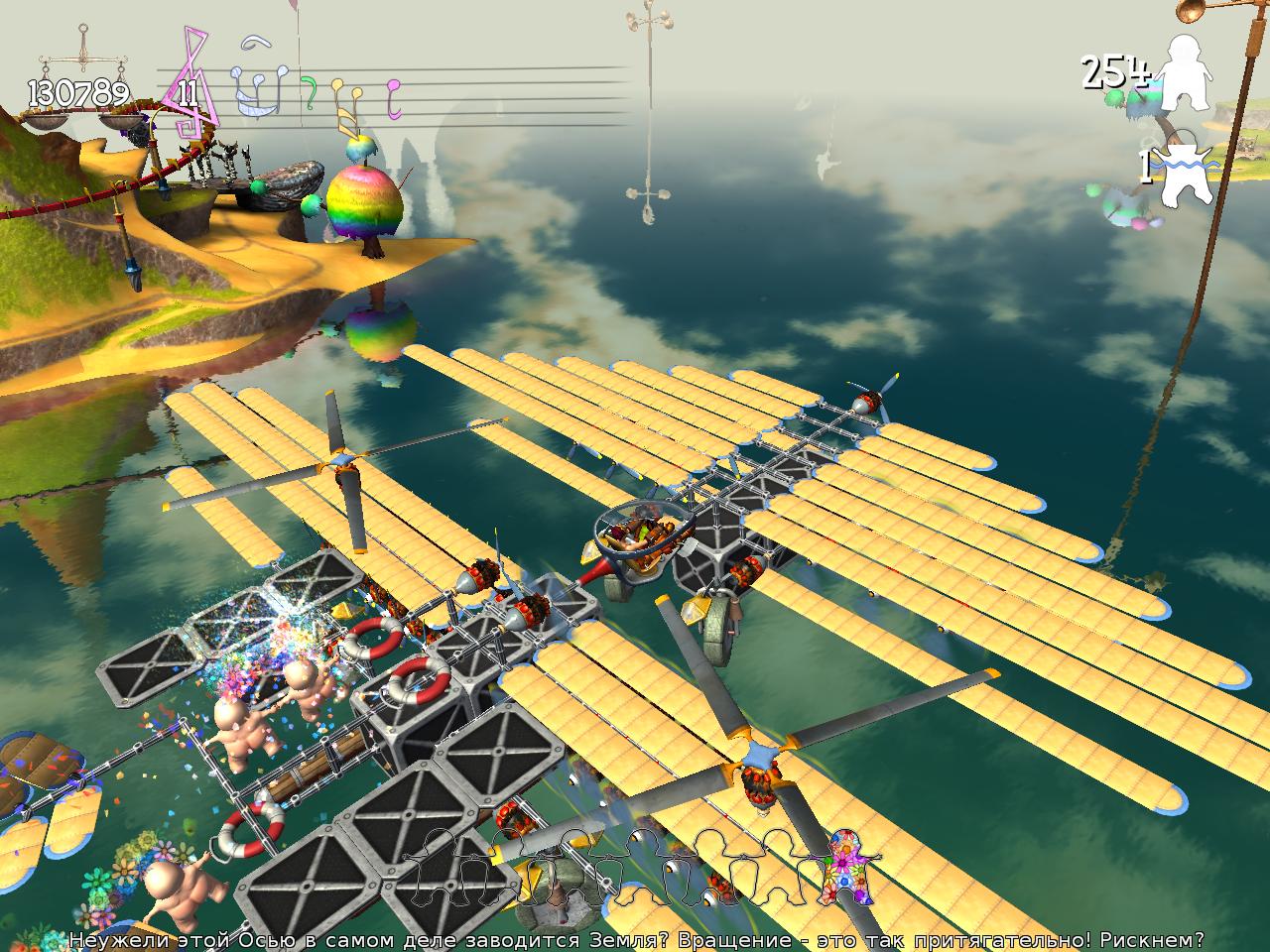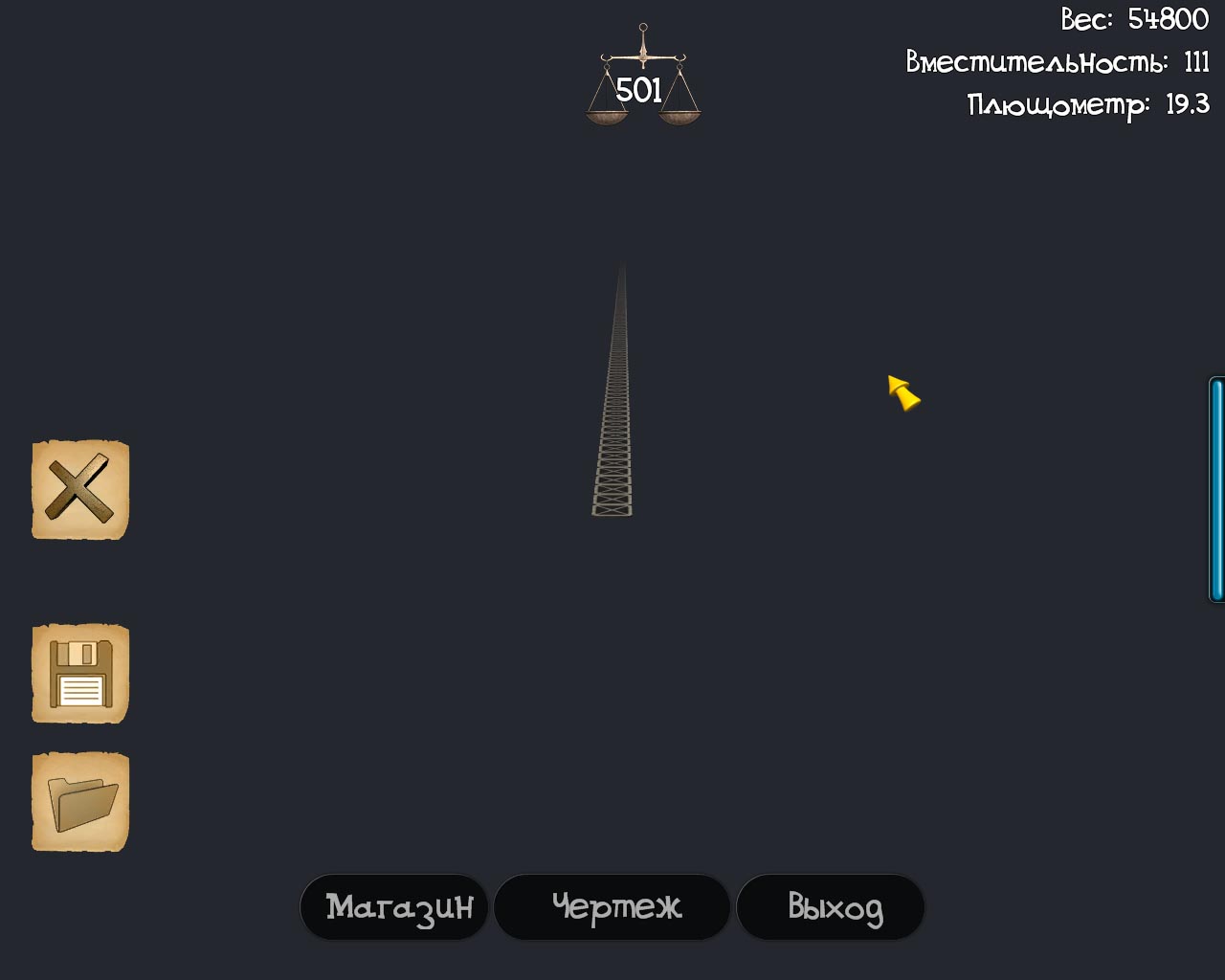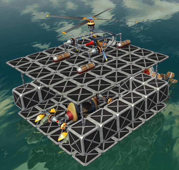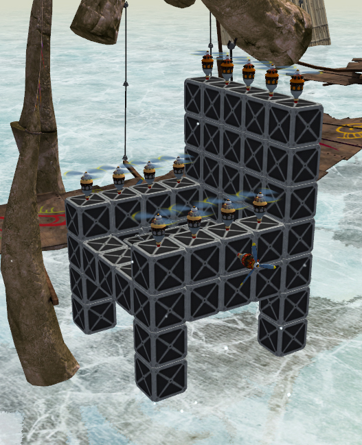 Попытался создать мощное летательное средство. Использовал сначала 3 верних пропелера+4 толкающих вперед. Ничего не получилось. Решил 4 винта верхних сделать. Крайне переработал концепцию. Почти полчаса пытался зад с передом уравновесить. Вроде получилось. Но при полете это было совсем не так. Вообщем я даже возненавидил эту игру на тот момент :lol:
